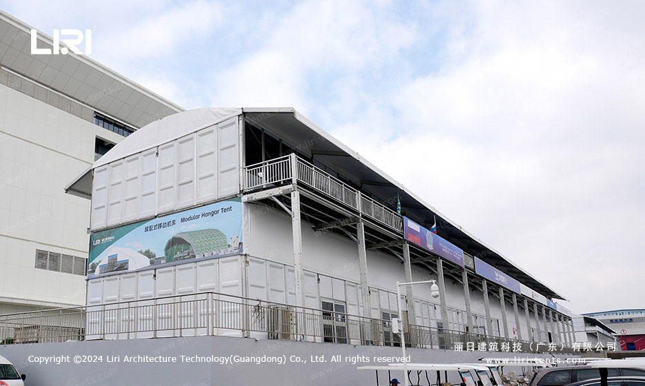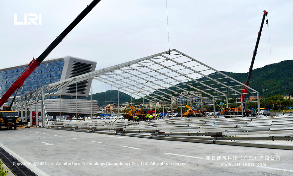 篷房的选择还需结合场地环境和地形特点。例如,当场地存在河流、大石等障碍物时,可通过调整篷房位置或设计规避障碍,满足快速搭建需求。如果场地周边有建筑或设施限制,也需在尺寸选择上有所考量。对于特殊地形,可以加装可调节脚手架地台,确保篷房稳固搭建。