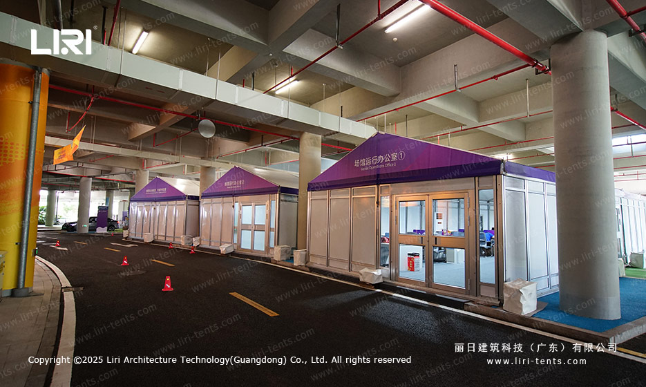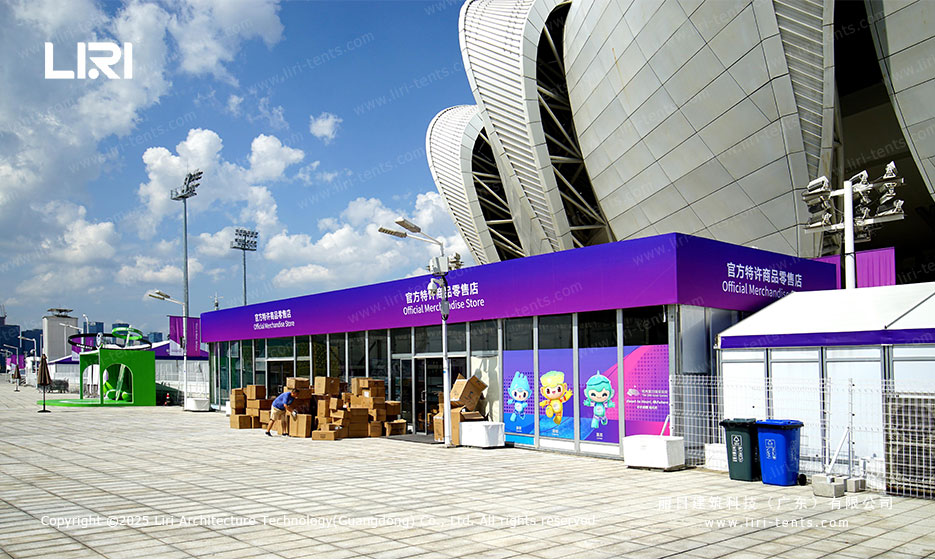 体育赛事篷房通常采用高强度的铝合金框架与pvc篷布相结合的结构,坚固耐用,具备抗风抗雪能力。幕墙可搭配硬体墙板或玻璃等材料,以调节篷房内部的光线亮度。此外,篷房采用模块化结构,能够在任意场地快速部署,并在赛事结束后迅速拆卸或迁移,灵活性较强。