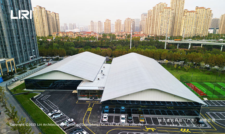 篷房球馆可采用弧形、拱形、弯柱形、多边形等创新造型,增强空间层次感与视觉冲击力。双层篷房设计更可增加使用面积,并形成独特的建筑轮廓。