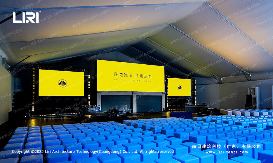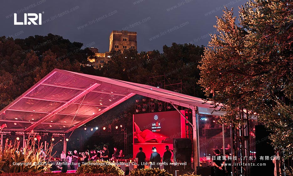篷房内部空间开阔,没有多余的支撑结构,可以完全根据活动主题和需求进行自由布置。无论是装饰、灯光还是舞台背景,都可以灵活规划。同时,舞台、观众区、餐饮区等功能区域的设计也更加随心,轻松打造独特的活动氛围。